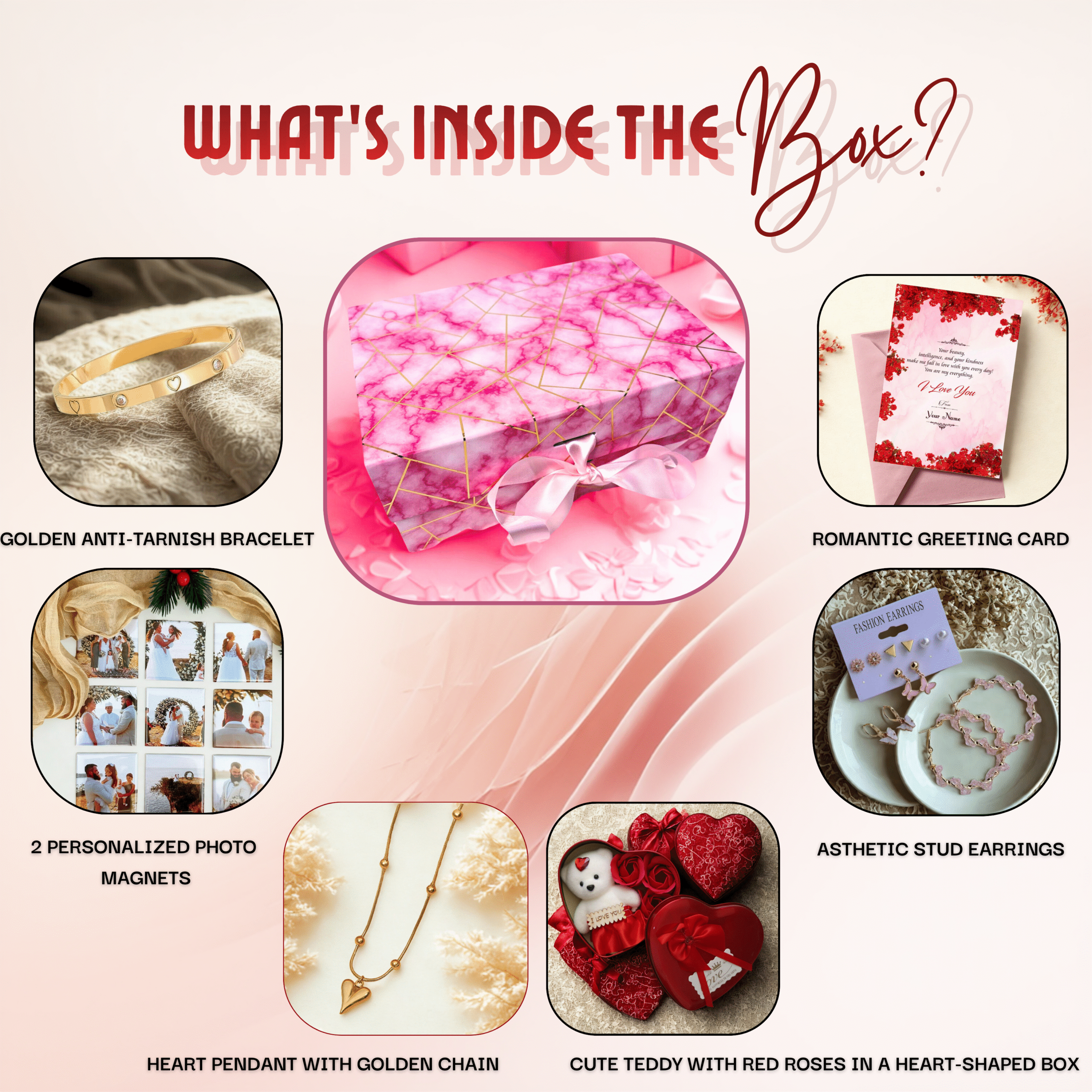 Inside, you’ll find beautifully crafted anti-tarnish jewellery, including a heart & stone bracelet and a matching heart pendant designed for everyday elegance and long-lasting shine. The hamper also includes a set of 6 trendy fashion earrings, offering versatile styling options for every mood and outfit.